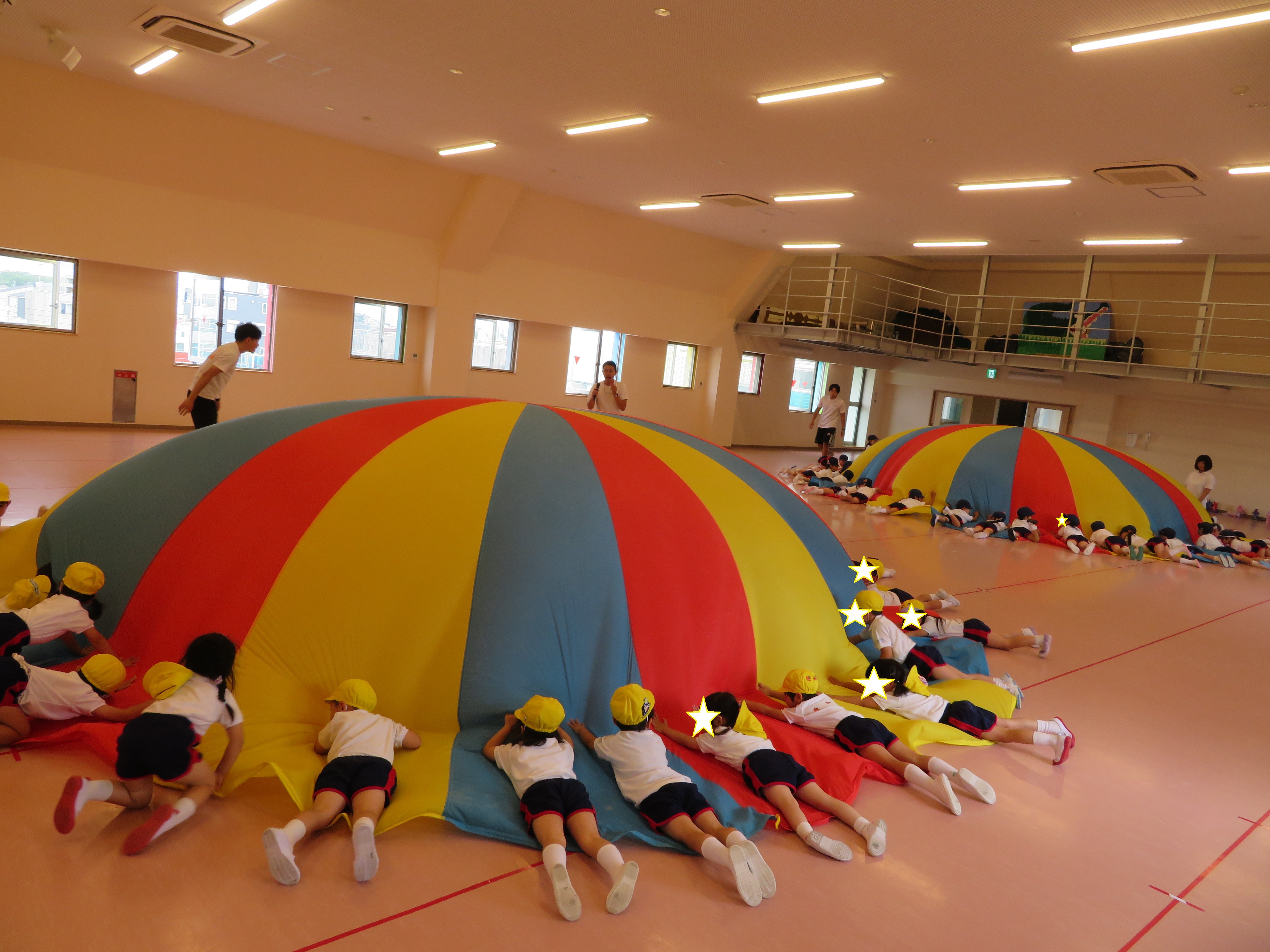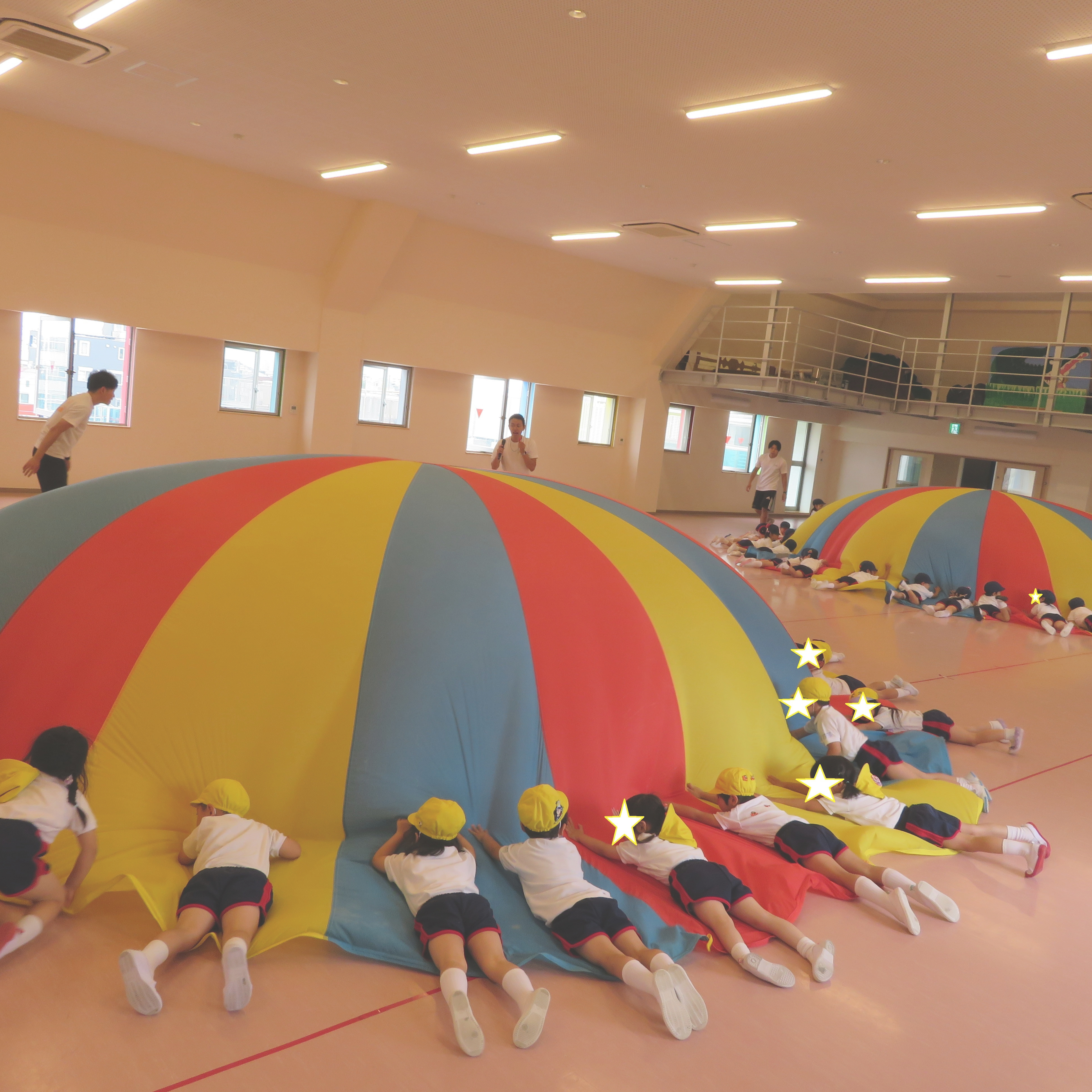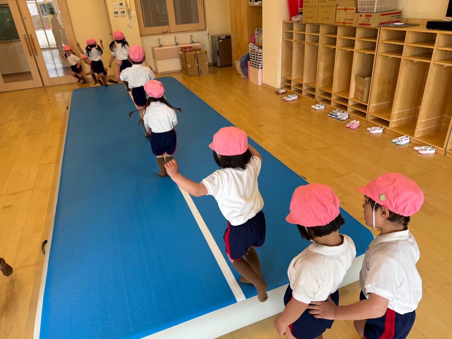 エアーマットを歩いて、走って、スキップして‥マットの丁度良い硬さに身体が自然と跳ねて子ども達はお気に入り。