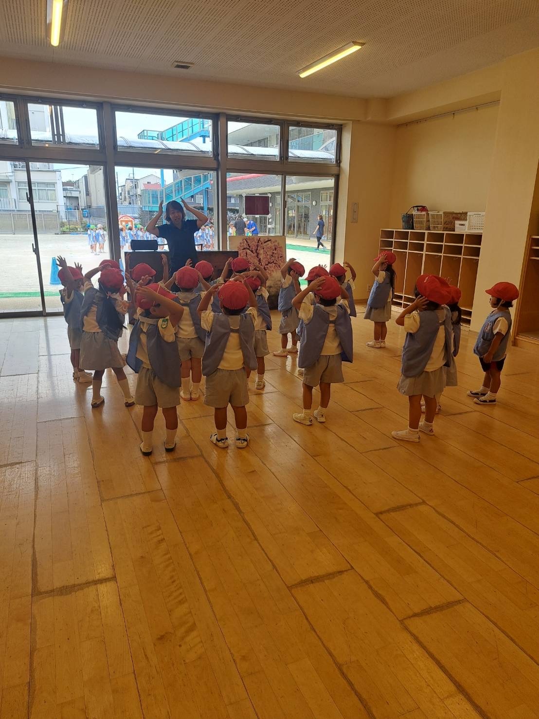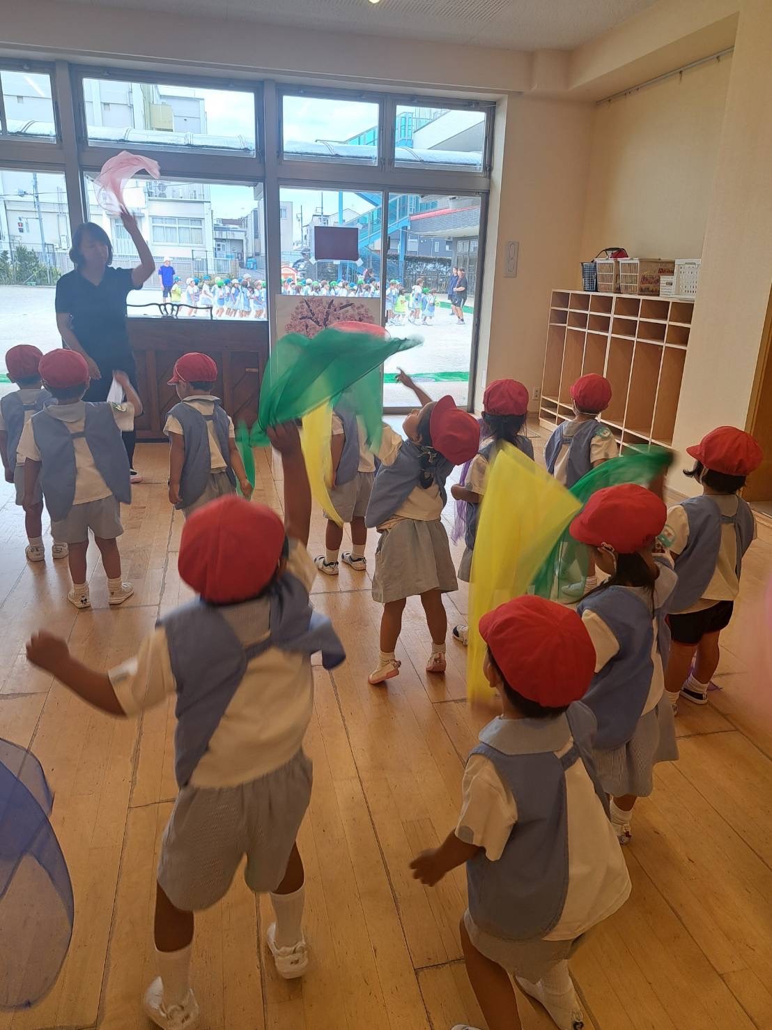 スカーフを四分、八分、2分音符に合わせて振ります。思い思い感じた音に合わせて振っていました。